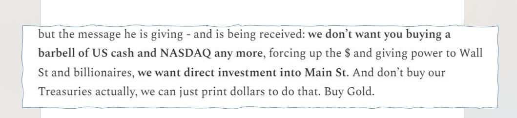 We looked at some of the Geopolitics in more detail over at the sister substack (This is not Investment advice, Middle Power Play, the Globalists are regrouping) as well as here (The court of King Donald).
