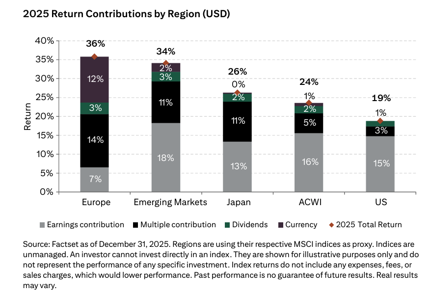 Most obviously we can see that of the group, Europe delivered the highest return to a US$ based investor last year, despite having the lowest earnings growth. This partly reflected a bigger multiple expansion than the other markets, but also a 12% return from the currency.